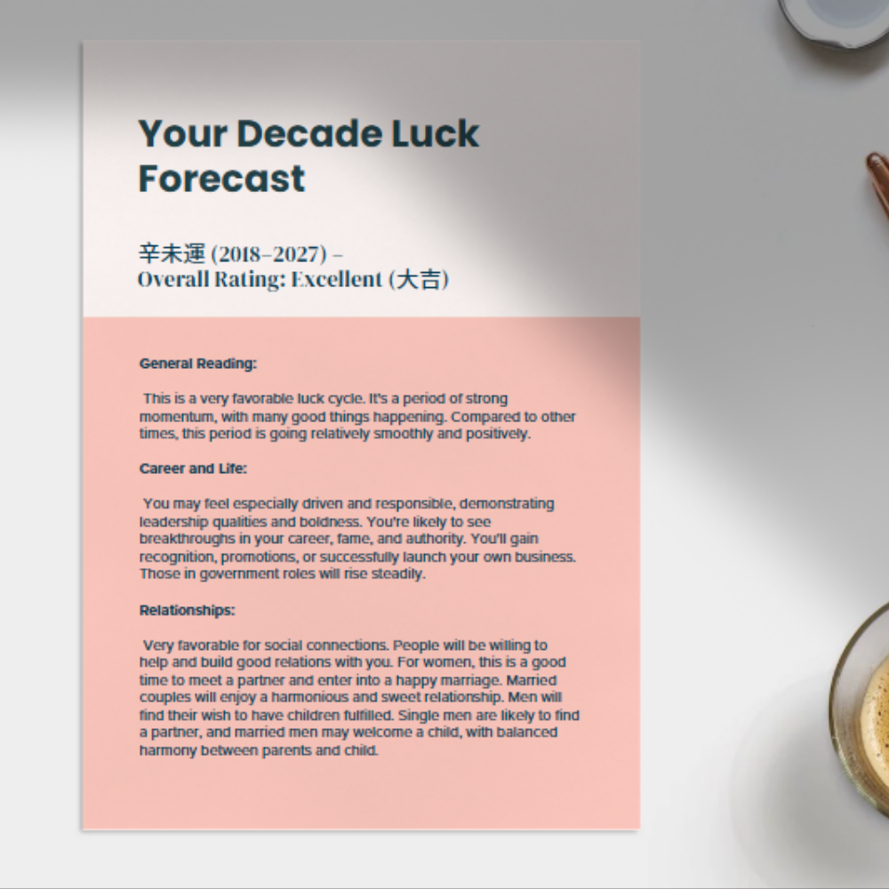 ✔ Your Luck Pillars – Gain insight into the decades of your life when opportunities will surge, and when caution is required. Know when to act, when to wait, and when to pivot.