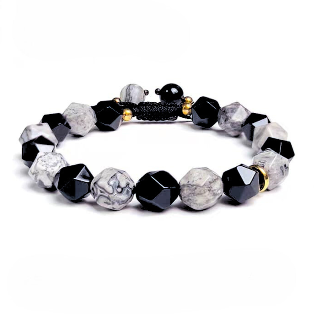 The Black Onyx – Odin’s Will II bracelet features 10mm stones of volcanic black onyx and Picasso jasper, complemented by titanium-steel accents and a woven adjustable cord. Each element is selected for its resonance with Quantum Chi—subtle yet potent energetic frequencies that support clarity, willpower, and grounded strength.