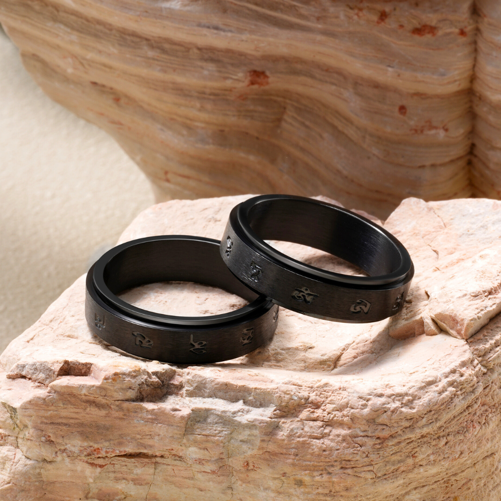 The Conqueror is a pair of matte black mantra rings created for those who lead without asking, and win without noise. With protective inscriptions etched around its surface and a shadow-forged finish, this ring deflects distraction, amplifies clarity, and grounds your intention. Whether navigating business, strategy, or personal transformation—it reminds you: the most dangerous force is the one that moves in silence.