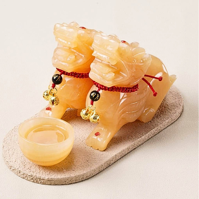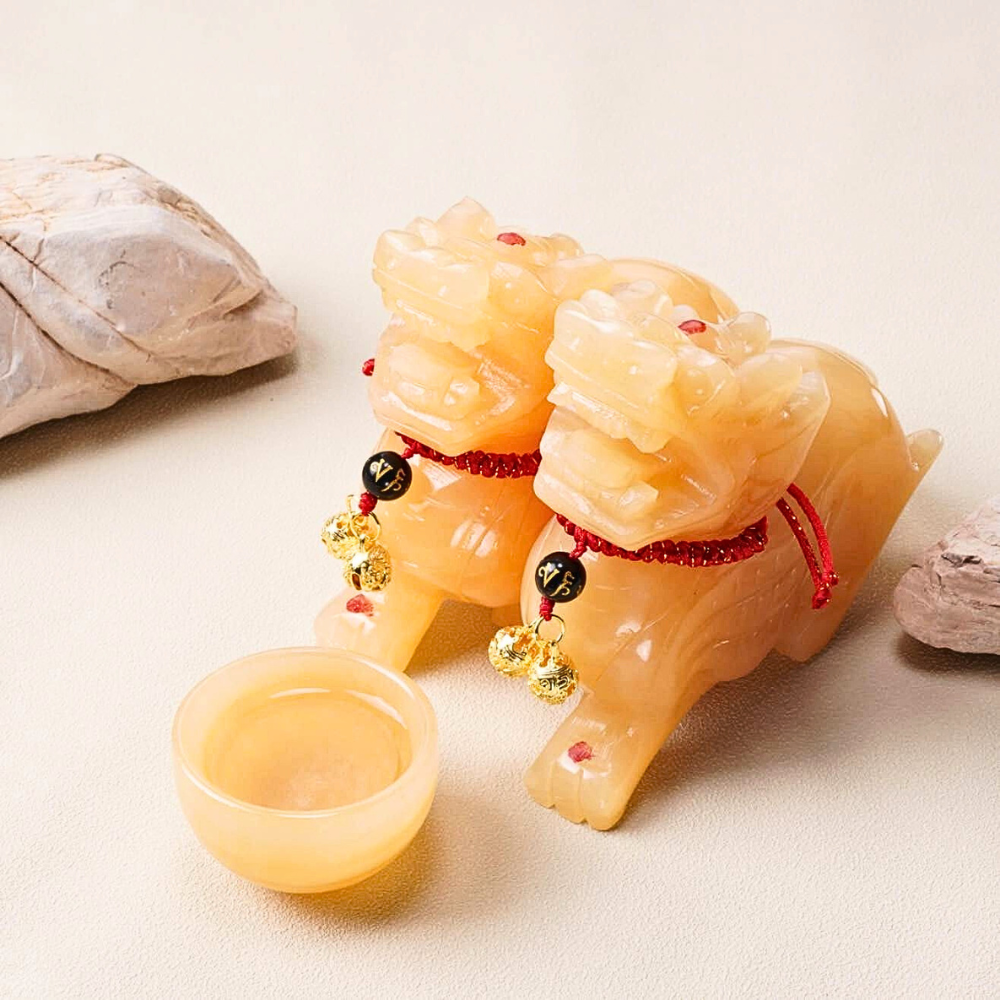 The Twin Keepers of the Auspicious Flow are a pair of protective figurines, meticulously crafted from natural yellow jade, a stone long revered for its connection to the Earth element, wealth stability, and imperial power.