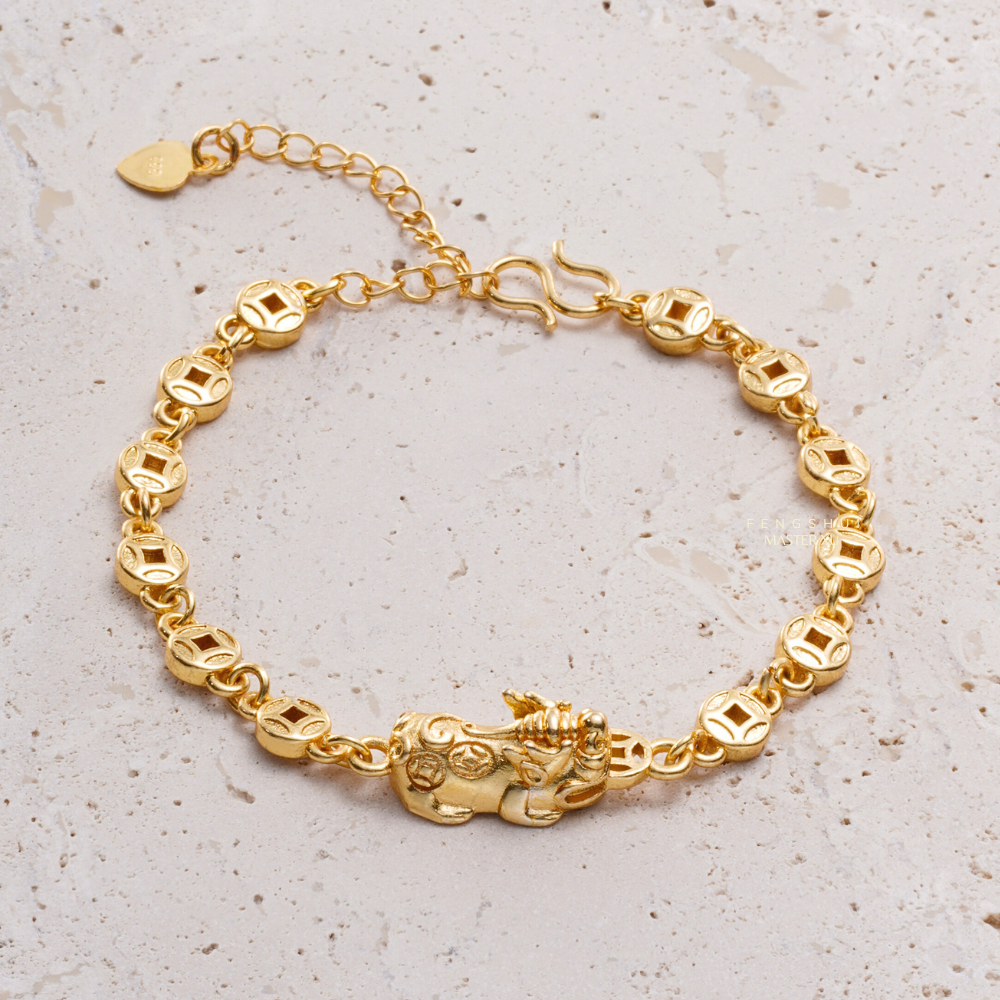 Prestige Imperial is a dainty yet commanding bracelet adorned with gold-plated wealth coins, linked to a detailed Pixiu figure known for its power to attract and retain fortune. Adjustable for daily wear yet rich with energetic intent, it is ideal for those who value elegance and wealth energy equally. Let this bracelet serve as your golden channel to financial flow, energetic protection, and royal-level luck.